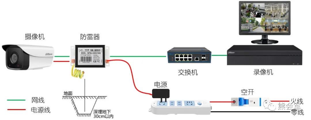 *后,我們看一下,整個系統的結構圖。市電經過空開給防雷器供電,防雷器再給攝像機供電。攝像機信號經過防雷器傳輸給交換機。*后,防雷器的地線與接地體進行連接,它的作用就是把多余的電流引入地下來保護設備。